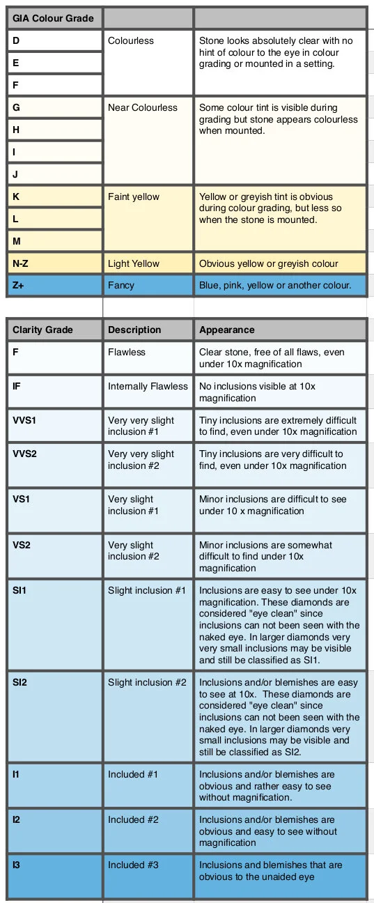 Diamonds are graded according to the GIA (Gemological Institute of America) colour chart.