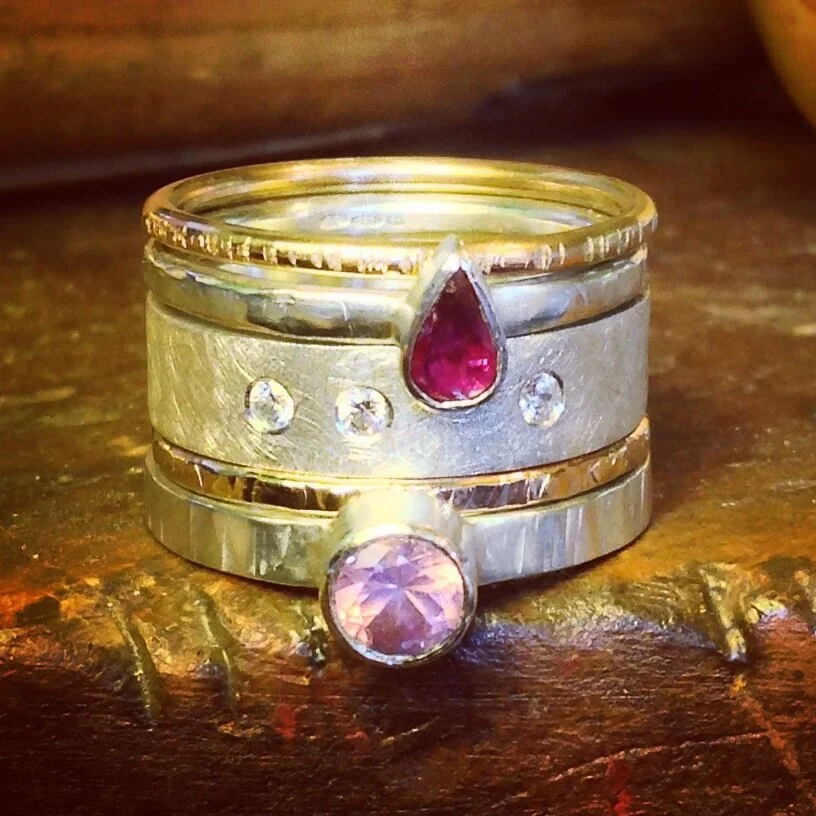 Silver and gold stacking rings set with a pear shaped vintage ruby, pink fair trade spinel and cubic zirconium.