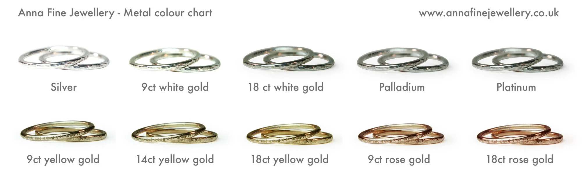 Here's a comparison chart to help give you an idea of the differences in precious metal colours...